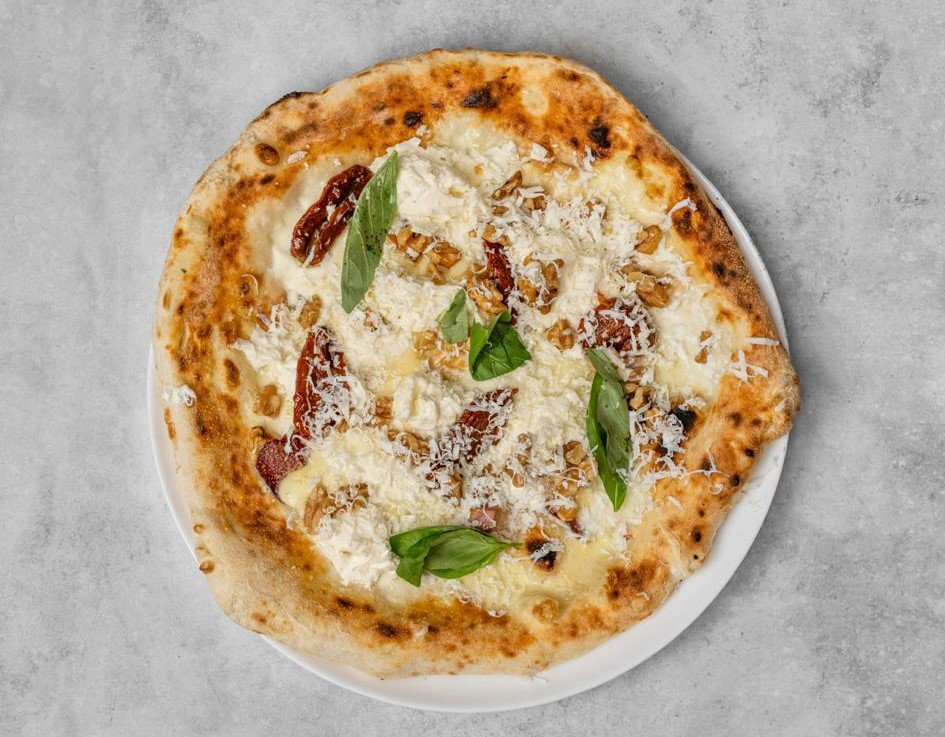 mozzarella de bufflonne, speck, tomates séchées, noix stracciatella, cacioricotta, huile d’olive, basilic